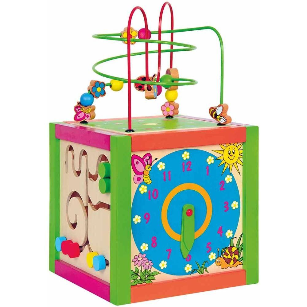 Obsahuje xylofon s paličkou, hodiny, počítadlo, bludiště