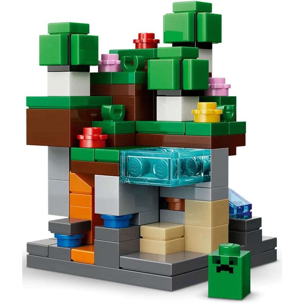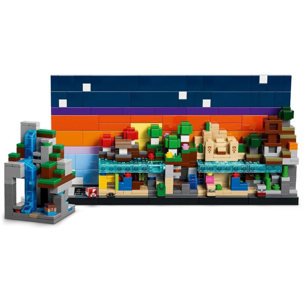 Tato stavebnice LEGO® obsahuje biom hor, květinový les, houbová pole, poušť a savanu a minifigurky Stevea, Creepera, krávomůrky, Huska a plenitele