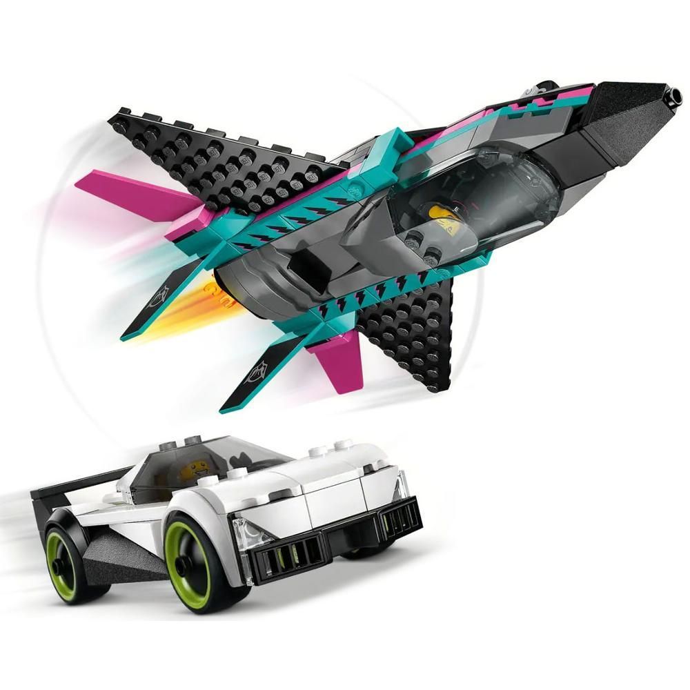 V krabici najdete vše, co děti potřebují k sestavení superauta a tryskáče, minifigurku pilota a řidiče pro napínavá závodní dobrodružství