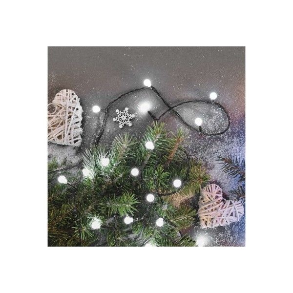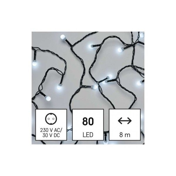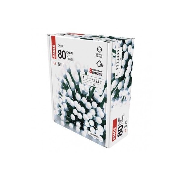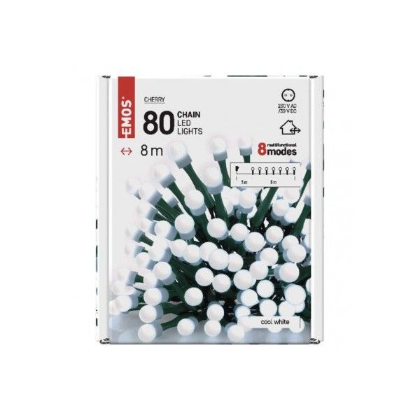 LED vánoční cherry řetěz – kuličky, 8 m, venkovní i vnitřní, studená bílá, programy