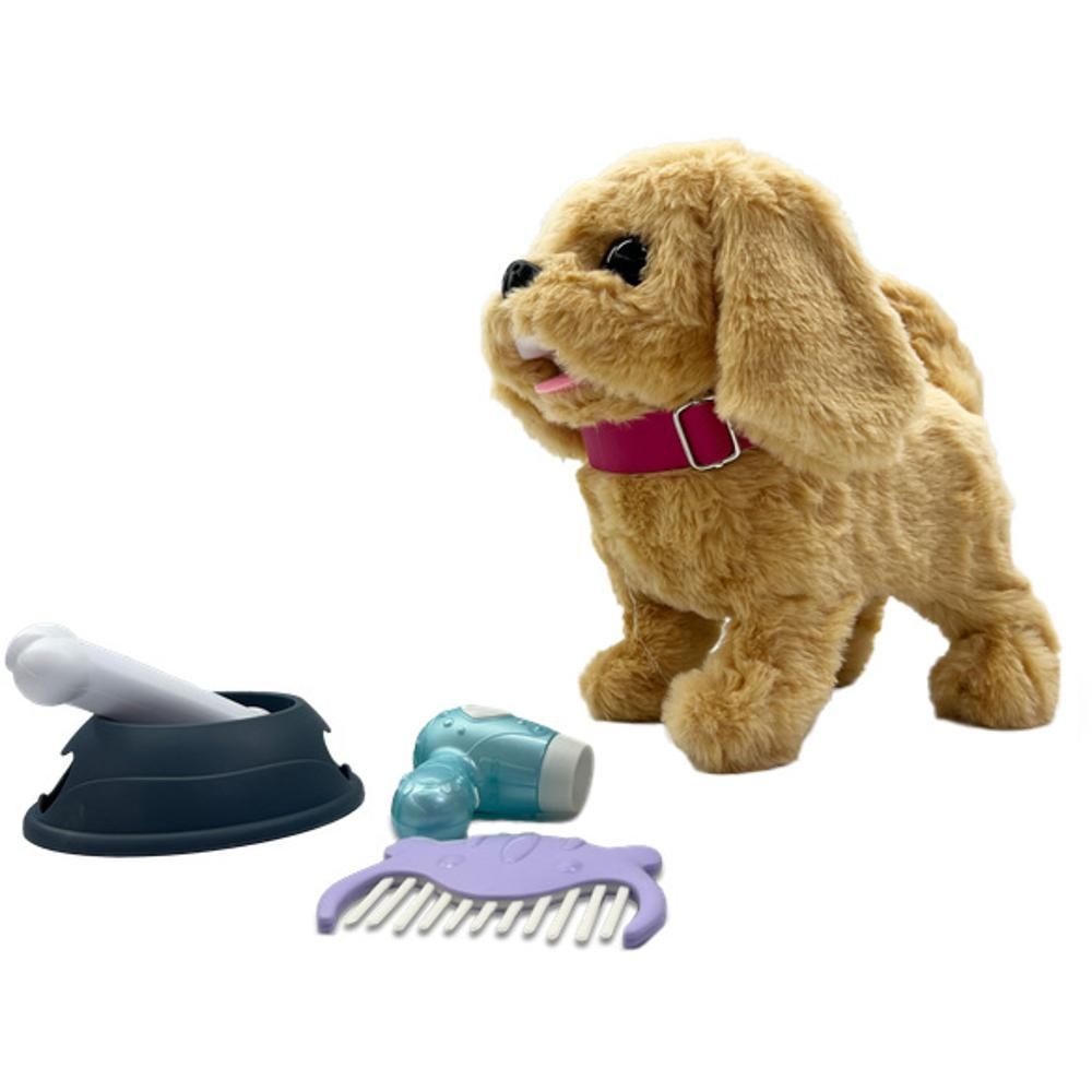 Balení obsahuje béžového pejska, hřebínek, mističku na jídlo a kostičku