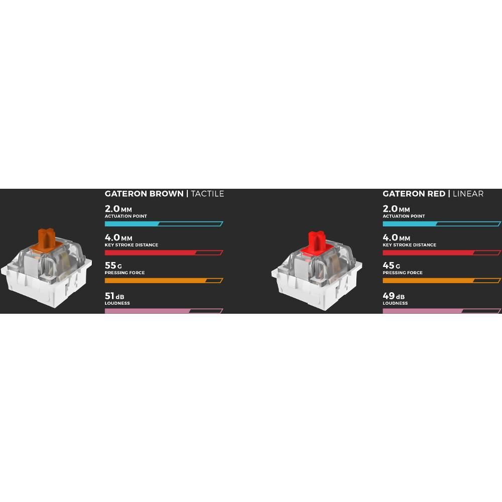 Zažijte přesnost s Gateron Red nebo Gateron Brown - mechanickými spínači uznávanými hráči, které se vyznačují lineární charakteristikou a vysokou dynamikou (Gateron Red) a znatelným bodem spouště a plnou všestranností(Gateron Brown). Odolnost? Ani o tu se nemusíte bát. Oba typy spínačů zajistí životnost 50 milionů kliknutí.